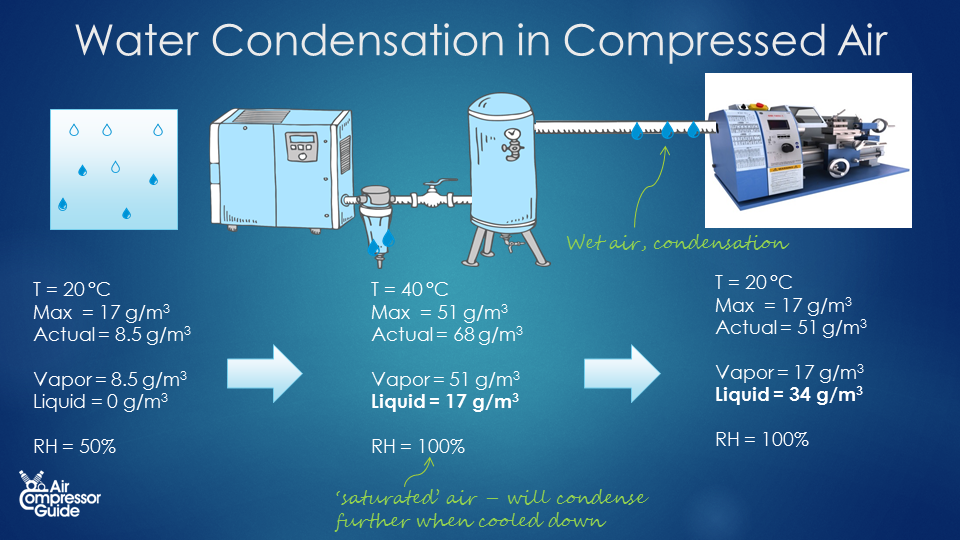 如果進入的水蒸氣高于壓縮空氣可以容納的水蒸氣,一旦被壓縮,它們中的一些會凝結(jié)成液態(tài)水。